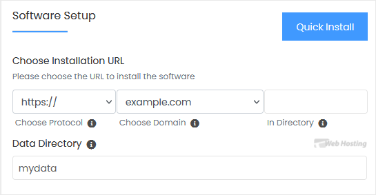 - Choose Installation URL: Choose the appropriate protocol/domain. Inside the "In Directory" field, should you want to install this in a directory, i.e., example.com/directory, enter the directory name. Otherwise, please, leave it blank to install in your main domain, i.e., example.com.